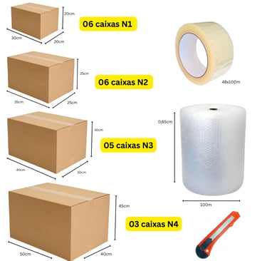 20 Caixas + 100m Plástico Bolha + 100m Fita Adesiva + Estilete.
