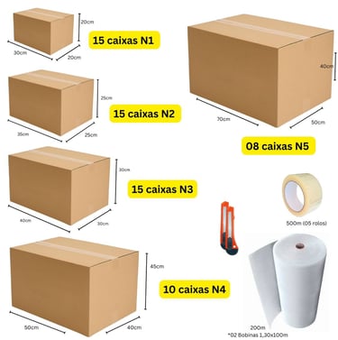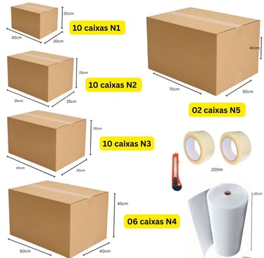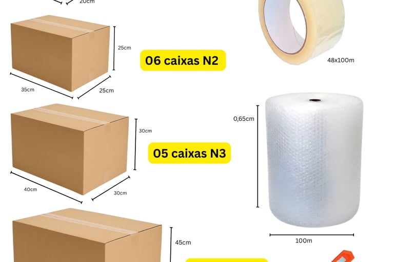 63 Caixas + 8 Gigantes + 200m Plástico Bolha + 500m Fitas Adesivas + Brinde