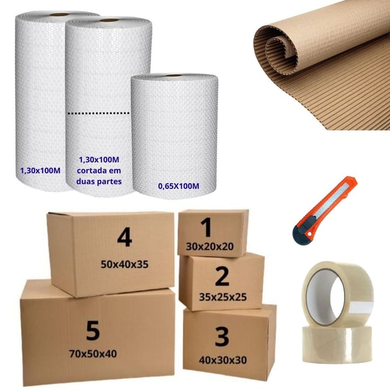 Monte o seu Kit Mudança ideal! Solução completa com caixas de papelão (grande, pequeno e médio), fita adesiva e plástico bolha (grande, pequeno e cortado). Tudo o que você precisa para embalar com segurança.